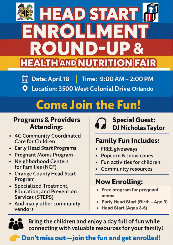 Families are invited to join us for a Head Start Enrollment Round-Up & Health and Nutrition Fair on Saturday, April 18, from 9 a.m. to 2 p.m. at 3500 West Colonial Drive in Orlando.