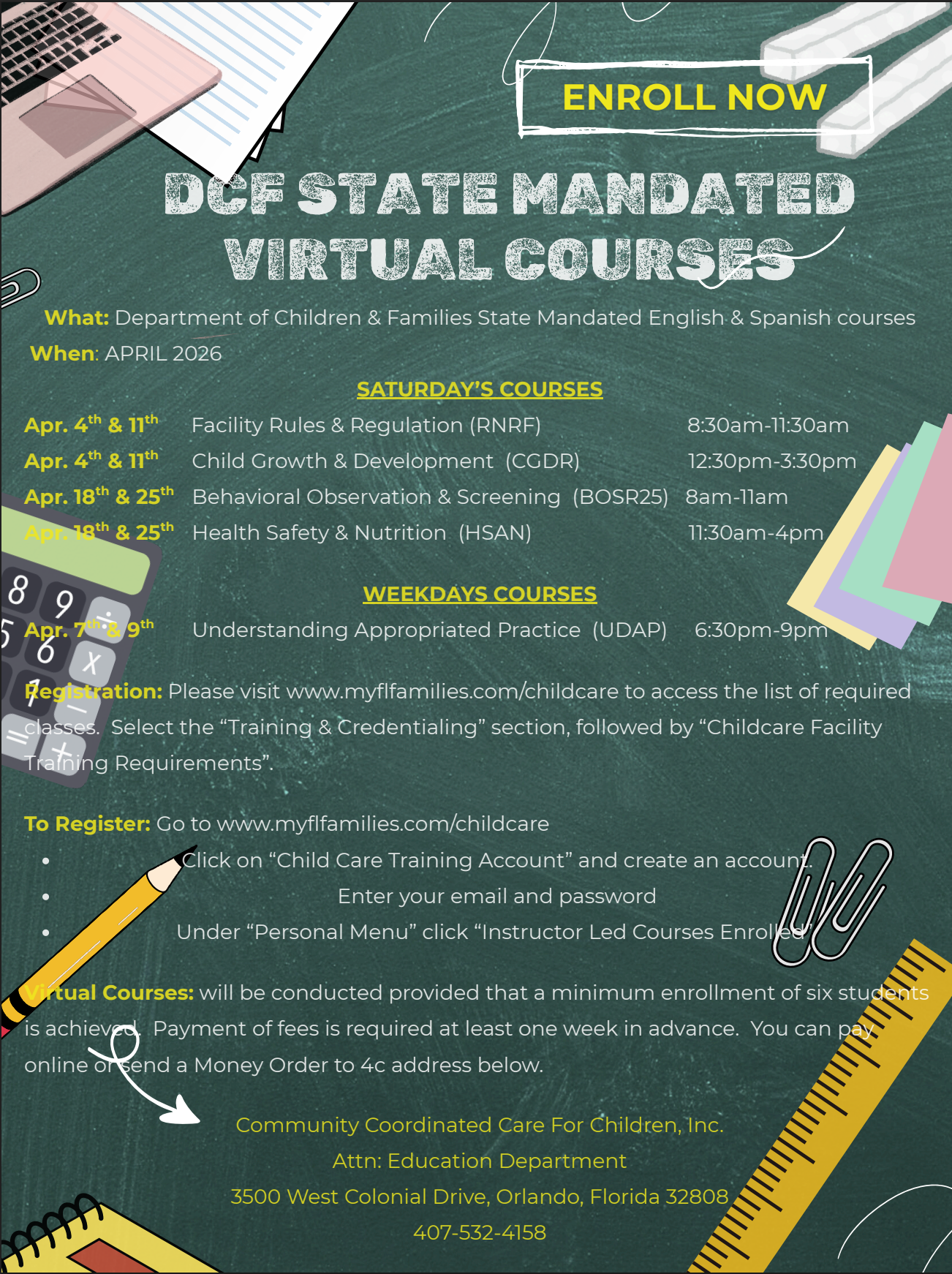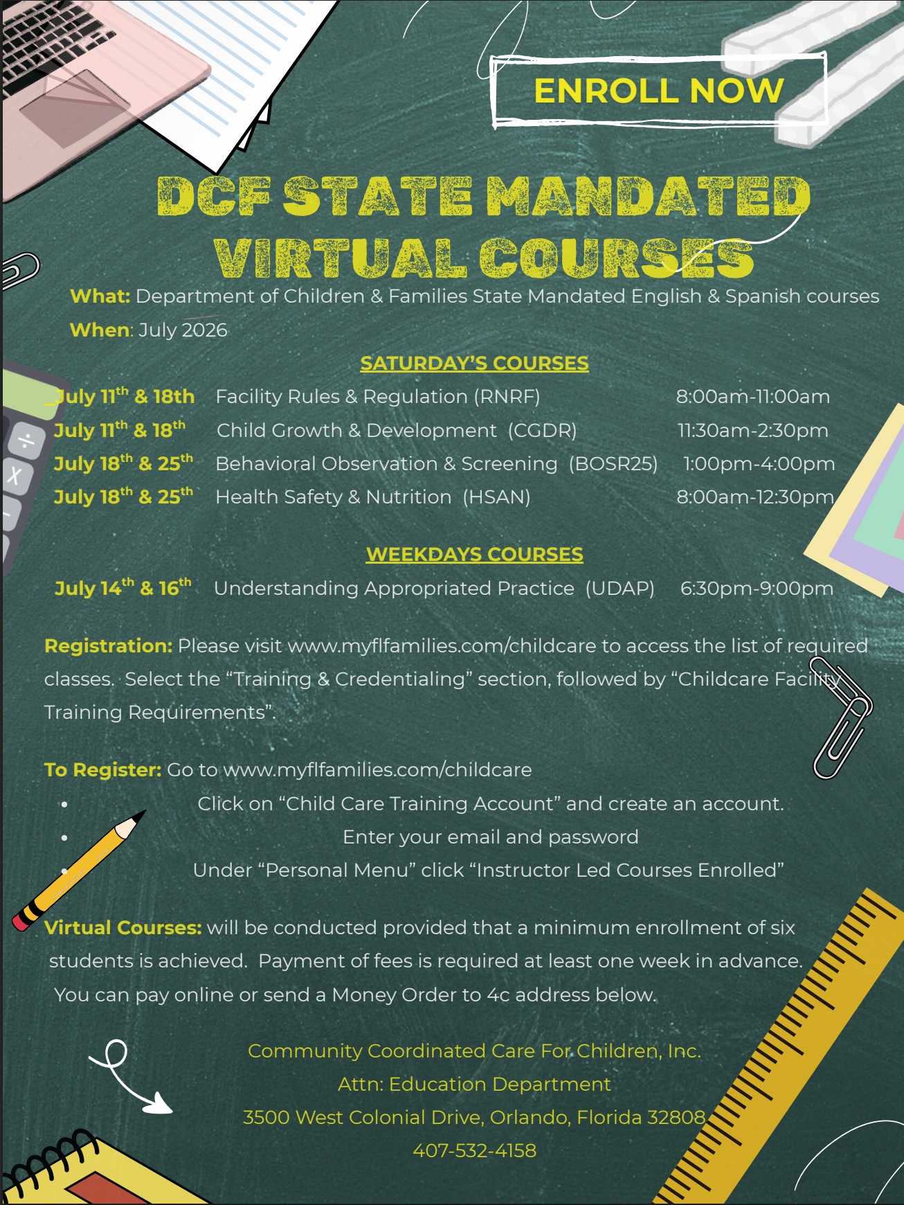 Special Accommodations If you need special accommodations in order to participate in the child care training process, contact the Education Department at least two weeks prior to the first training date at (407) 532-4264 between the hours of 8 a.m. to 4:30 p.m. Calls will be received Monday through Friday.